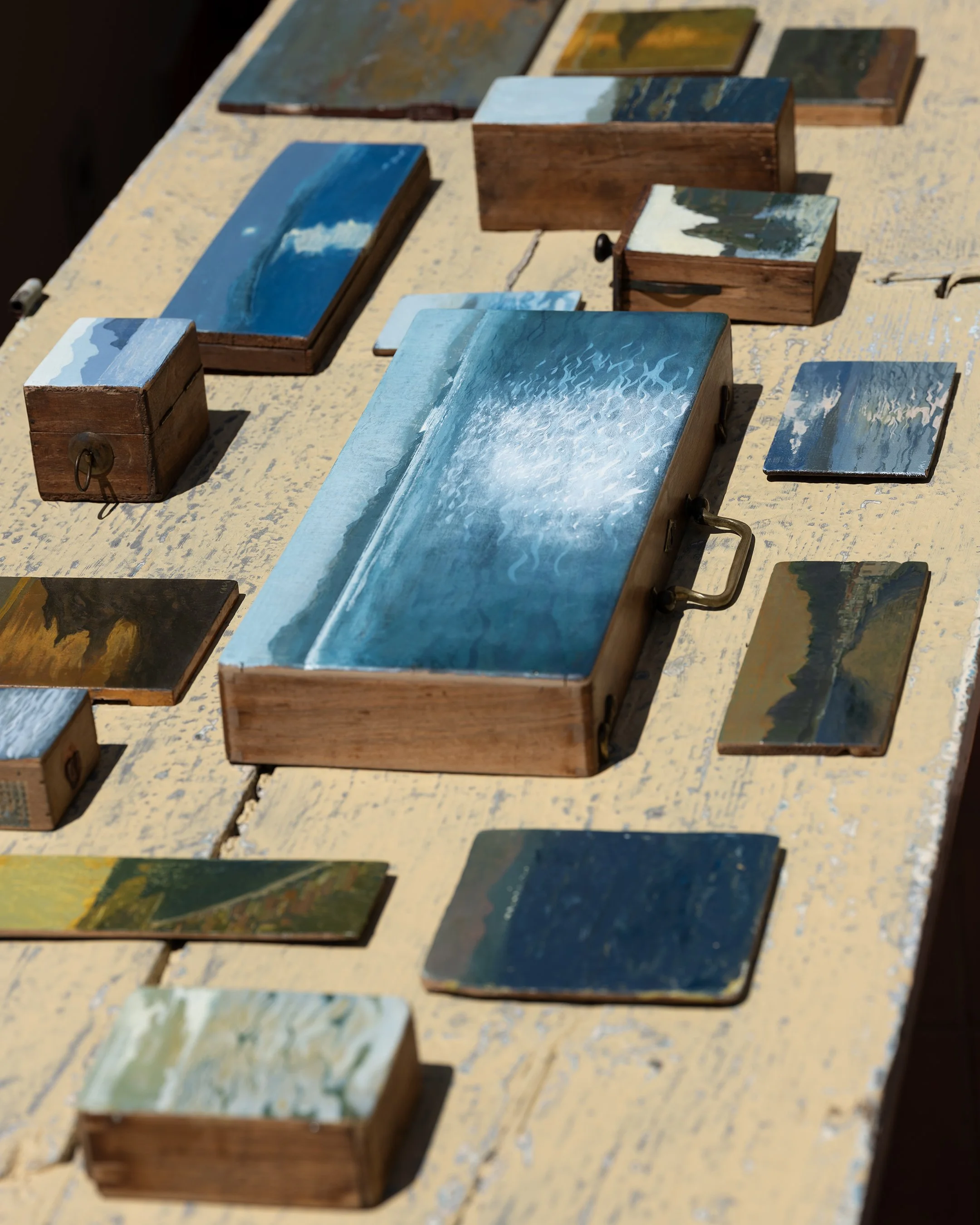This body of work acts as a deliberate counterpoint to the artist’s ongoing conceptual projects including Light on Water and TILL. While Light on Water traces an abstract visual language developed since art school, these paintings return to source: to observation, materiality, and the particular atmospheres of place. Water remains central in Cass’s practice, but here the vantage point is included – indeed, it becomes the subject. Thirty-five of these paintings were recently on view at Tatha Gallery – which still holds a stock of the works. Others can be purchased from the studio.